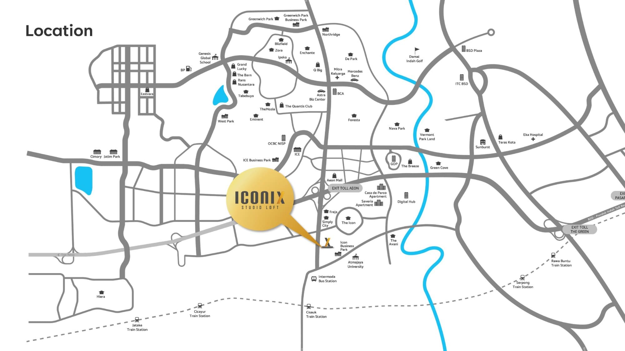 Iconix Studio Loft is strategically located, with all units facing Jalan Boulevard BSD Utama with a ROW of 40. This offers the best location and easy accessibility. To reach the commercial cluster, it is only 500 meters from the Serpong – Balaraja toll exit, making it a high-value investment opportunity.
